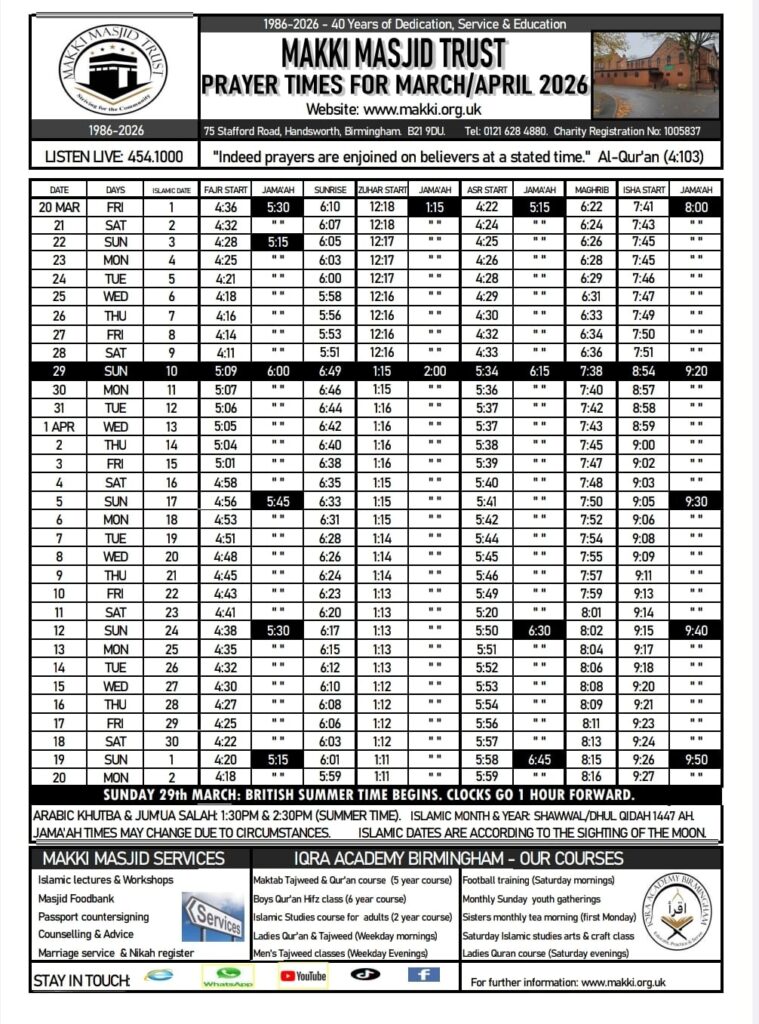 EXCELLENT Based on 105 reviews Posted on asim hassanTrustindex verifies that the original source of the review is Google. 2nd jumma prayer time in summer is 2:20pmPosted on Shivan SalihTrustindex verifies that the original source of the review is Google. May allah bless this mosquePosted on Afifah AdamTrustindex verifies that the original source of the review is Google. Mashallah lovely mosque, prayed there during my visit to Birmingham, good facilities for women to prayPosted on Abdul HamidTrustindex verifies that the original source of the review is Google. Masha Allah nice mosquesPosted on kurfiTrustindex verifies that the original source of the review is Google. Beautiful masjid, loved it
